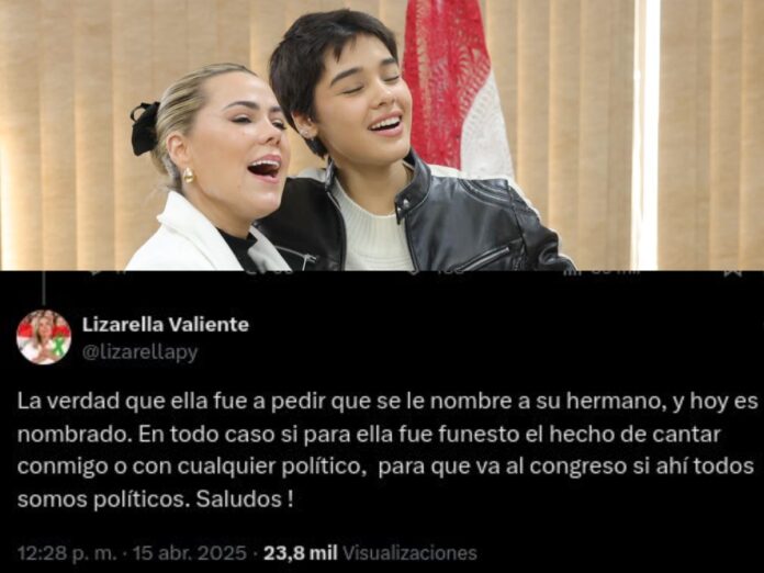 Un inesperado cruce entre la senadora Lizarella Valiente y la cantante Ayelén Alfonso desató una nueva polémica política. Valiente reveló en redes sociales que Alfonso solicitó el nombramiento de su hermano tras una visita al Congreso, hecho que, según la legisladora, finalmente se concretó. «Ella fue a pedir que se le nombre a su hermano, y hoy es nombrado», expresó, desatando una ola de críticas por un presunto caso de tráfico de influencias.
