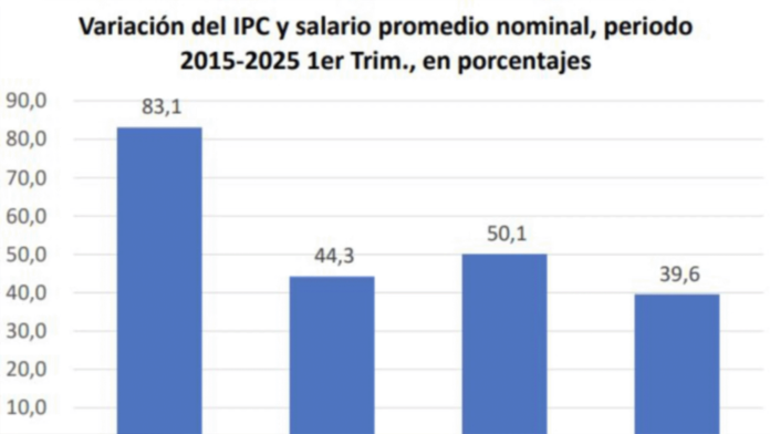 Los rubros que más aumentaron en precio fueron los alimentos (83%) y el transporte (44%). En contraste, los salarios ajustados a valores de 2015 reflejan un estancamiento. “Excepto los funcionarios públicos, todos los trabajadores ganan menos que hace diez años”, afirmó el economista.