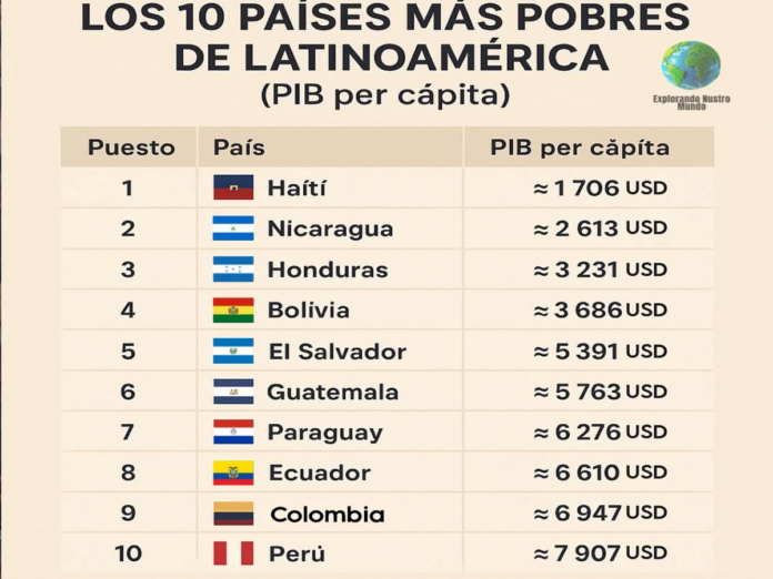 Un informe basado en datos del Banco Mundial y la Cepal, correspondientes a 2022 y 2024, sitúa a Haití como el país más pobre de América Latina. La clasificación utiliza indicadores como el Producto Interno Bruto (PIB) per cápita, el coeficiente de Gini y los niveles de pobreza. Según el reporte, Haití presenta los menores índices de desarrollo y los mayores niveles de vulnerabilidad social.