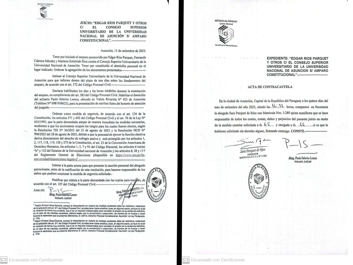 La Justicia Electoral otorgó un amparo a Edgar Ríos Parquet, Fernando Cabrera y Marlene Solalinde, quienes fueron electos en la Facultad de Derecho de la Universidad Nacional de Asunción (UNA) y aún no habían podido asumir sus cargos. La decisión se da luego de que el Consejo Superior Universitario (CSU) negara la asunción, a pesar de que el Tribunal Electoral Independiente (TEI) ya los había proclamado ganadores el pasado 23 de agosto.