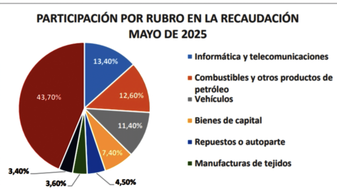 Según el informe de la Dirección Nacional de Ingresos Tributarios (DNIT) correspondiente a mayo de 2025, los sectores de informática y telecomunicaciones (13,4%) y combustibles y derivados del petróleo (12,6%) representan en conjunto el 26% del total recaudado por impuestos aduaneros.