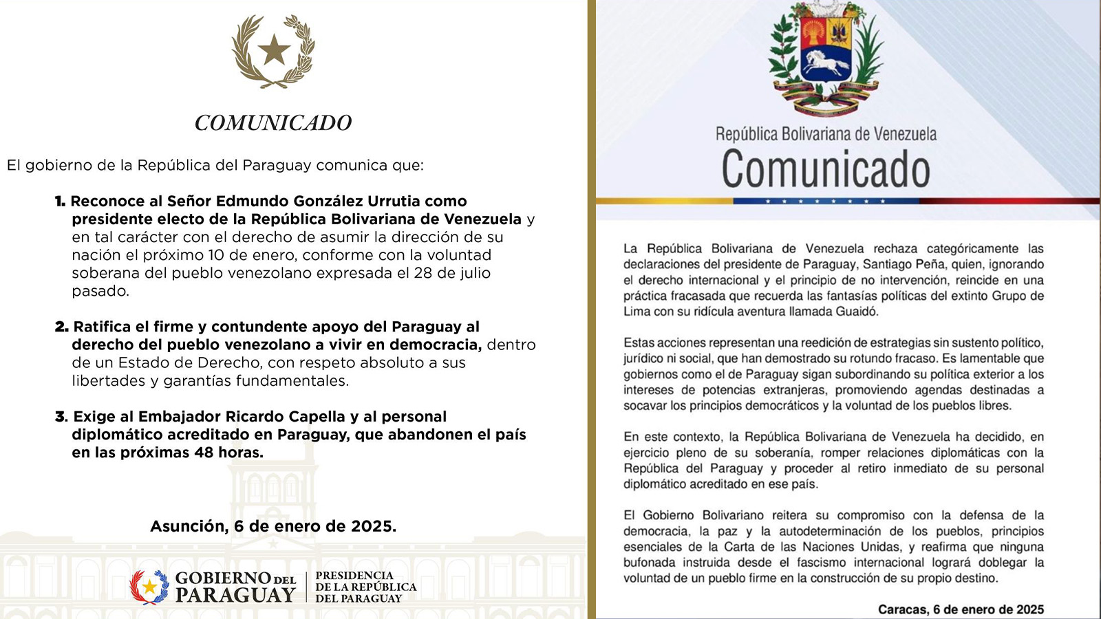 La República Bolivariana de Venezuela ha decidido romper relaciones diplomáticas con Paraguay tras las declaraciones del Presidente Santiago Peña, quien expresó su apoyo al excandidato presidencial venezolano Edmundo González, quien se autoproclamó mandatario electo de las pasadas elecciones en Venezuela. La ruptura fue formalizada mediante un comunicado emitido por el gobierno venezolano, que también solicitó el retiro “inmediato” de todo el personal diplomático paraguayo en Caracas.